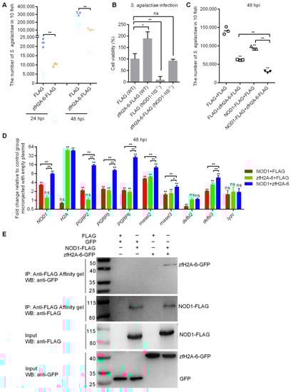 The effects of NOD1 and zfH2A-6 in the defense against S. agalactiae infection. (A) The effect of zfH2A-6 overexpression in the zebrafish larvae on the proliferation of S. agalactiae. (B) The effect of zfH2A-6 on the cell survival in WT and NOD1-deficient cells with S. agalactiae infection. (C) The effect of NOD1 on the antibacterial effect against S. agalactiae infection with or without the existence of zfH2A-6. (D) The transcription regulation of NOD1 on the antibacterial genes in the case of S. agalactiae infection with or without the existence of zfH2A-6. Data are expressed as mean ± SEM of three independent experiments. * p < 0.05; ** p < 0.01; ns—not significant. The asterisk above the error bars indicate statistical significance using the group transfected with empty plasmid as the control group. The asterisk above the bracket indicate statistical significance between the two groups connected by the bracket. (E) NOD1 interacts with zfH2A-6. The interaction between FLAG and GFP or zfH2A-6 is used as the negative controls.
