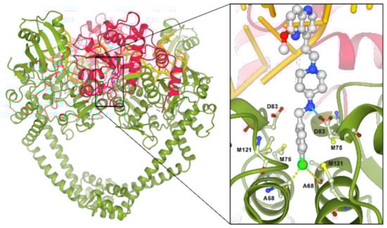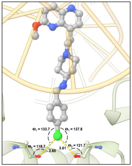 Symmetrical bifurcated halogen-bonding of compound 13 in complex with S. aureus DNA gyrase and DNA molecule (PDB ID: 6Z1A) [13]. GyrA subunit is shown in green, compound 13 is colored in grey (ball and sticks representation) and DNA in pale orange. Halogen bonds are represented as yellow dots.