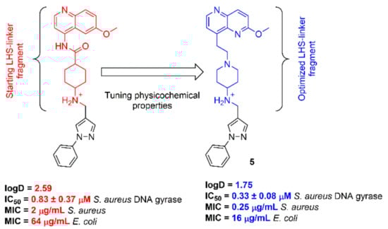 The impact of lipophilicity (logD) and structural flexibility on the change in IC50 for a compound containing methoxy-quinoline cyclohexyl-amide LHS-linker combination against S. aureus DNA gyrase from our previous study (left) [18] and compound 5 (right) comprising naphthyridine aminopiperidine LHS-linker construct confirming the rationally optimized physicochemical properties and reduced rigidity (amide vs. ethylene) leading to the improved potency and antibacterial activity.