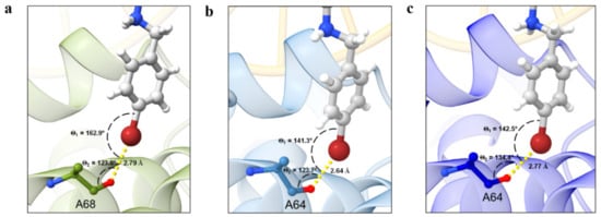 Halogen-bonding interactions for compound 14 as predicted by flexible molecular docking calculations within the RHS binding site of: (a) S. aureus DNA gyrase (PDB ID: 2XCS) [9], (b) S. aureus Topo IV homology model, and (c) E. coli Topo IV homology model. Enzymes are shown in green (DNA gyrase) and blue (Topo IV) ribbons, respectively, compound 14 is colored by element (ball and sticks representation), while DNA in pale orange. Halogen-bonding interactions are represented as yellow dots.