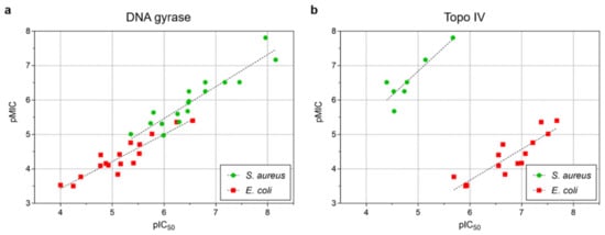 The correlation between antibacterial potency (pMIC = −logMIC in molar) of NBTIs and the corresponding S. aureus and E. coli inhibitory activity (pIC50 = −logIC50 in molar) of: (a) DNA gyrase and (b) Topo IV, respectively. A linear correlation may be observed for DNA gyrase of both bacterial strains (R2 = 0.864 and 0.856 for S. aureus and E. coli, respectively), while slightly inferior linear correlation can be obtained for Topo IV (R2 = 0.788 and 0.790 for E. coli and S. aureus).