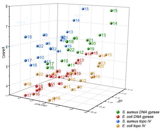 Since the compounds exhibit potent enzyme inhibitory activity in general, their whole cell potency depends particularly on the uptake into Gram-positive and Gram-negative bacteria (apart from being substrates for the previously mentioned efflux pumps), which depends on their physicochemical properties. In this context, one should be aware about that cell envelopes of Gram-positive and Gram-negative pathogens differ substantially in composition. This is particularly important in the case of Gram-negatives whose cell envelope, in particular its outer layer (that is missing in Gram-positives) is extremely protective for passage of highly lipophilic molecular entities due to tight packing of its lipopolysaccharide (LPS) rich content [27]. Additionally, the aquaporins are an integral part of the outer layer and restrict the diffusion of hydrophilic molecules with molecular weight (MW) around 700 Da [28]. Put differently, more positively charged (i.e., increased basicity) and suitably polar (i.e., lower logD) compounds with appropriate size (MW ~ 400–500, as for the majority of NBTIs) tend to have better permeation in Gram-negative bacterial pathogens [29]. Taking this into consideration, we further examined the relationship between the compound’s lipophilicity and the enzyme inhibitory activity and the whole cell potency by plotting the data on a 3D graph (Figure 6). The 3D plot distinguishes separated clusters for each of the bacterial targets (S. aureus gyrase (green), Topo IV (blue) and E. coli gyrase (red), Topo IV (yellow)) divided by the correlation between pIC50 and logD as independent variables, and pMIC as a dependent variable. On one hand, the increase in MICs is a reasonable consequence of the increase in the halogen size (12–15) and aforementioned rise in halogen interactions potency. On other hand, the increase in lipophilicity (logD) potentiates antibacterial activity (MIC), which is particularly noticeable for compounds 13–15 and 20 having highest logD values (~1.9–2.2), compared to compounds 16 and 17 with the lowest logD (0.44 and 0.19, respectively). These findings are congruent with the previously determined, specific, low to moderate lipophilicity range (logD ~ 0–3) that is optimal for passive cytoplasmic permeation, particularly in Gram-positive bacteria [30,31]. Nevertheless, the data represented in Figure 6 point to an important conclusion, i.e., a deft balance in NBTIs lipophilicity and on-target potency has to be achieved for high antibacterial potency. On one hand, the secondary amine and overall hydrophilicity has to be kept in order to achieve crucial interactions with DNA gyrase and Topo IV as well as to increase the overall optimal ligands’ solubility (that is decisive for passing the aquaporins rich outer layer of cell envelope in Gram-negative bacteria). On the other hand, higher, but not excessive lipophilicity increases cellular permeability (Supplementary Materials Table S1) and thus antibacterial activity especially on Gram-positive bacteria. Indeed, on-target activity is a prerequisite for antibacterial activity; however, how lipophilicity/hydrophilicity influence the antibacterial activity could be best observed by comparing DNA gyrase/Topo IV inhibition and antibacterial activity of compounds 18–20. Although, 19 is distinguished by the most equilibrated inhibition of DNA gyrase/Topo IV, both 18 and 20 surpass the latter in antibacterial activity. For 18 this might be a consequence of more potent inhibition of S. aureus DNA gyrase. 20 has in general more potent antibacterial activity on both Gram-positive and Gram-negative bacteria albeit having very comparable on-target potency as 19. The reason for such a difference in activity can be attributed to the fine-tuned lipophilic/hydrophilic properties of 20; these allow sufficient compound solubility and cell permeability; however, due to slightly increased hydrophilicity, 20 is probably a better substrate for Gram-negative aquaporins (for passing the highly restrictive outer layer), i.e., optimally lipophilic (for passing not only LPS compartment of the outer layer, but also the inner, lipid rich cytoplasmic layer) [31,32] and/or a worse substrate for the efflux pumps (see below). Further evidence on the influence of the lipophilicity/hydrophilicity balance on the antibacterial activity may be seen by comparing the most potent compound from our previous study [18] and compound 5 (both depicted in Figure 2). Approximately 4-fold increase in potency on E. coli DNA gyrase resulted in the same increase in antibacterial potency (evaluated by comparing MIC values). However, although we observed approximately the same increase in the potency on isolated enzyme from S. aureus, the antibacterial potency increased even more (8-fold). This increase in antimicrobial potency is apparently not influenced solely by the on-target activity. Since 5 is more hydrophilic than the amidocyclohexane derivative, one would expect it to have poorer permeability properties. Instead, the increase in antibacterial potency on S. aureus of 5 can only be explained by better permeability properties or the non-susceptibility to the efflux pumps. Increase in permeability is unlikely since the starting compound is slightly more lipophilic, but it is likely that lower lipophilicity of 5 makes it poorer substrate for S. aureus efflux pumps [33,34]. A similar conclusion can also be reached when comparing compounds activity on E. coli wild-type, and E. coli D22 and N43 strains. The increased membrane permeability of E. coli D22 increases the antibacterial potency up to 16× (2× in majority of cases), where the latter is improved the same or even more in E. coli N43 strain with removed efflux pumps (32× in majority of cases). This led us to a conclusion that the compounds have some difficulties in passing into the E. coli and are allegedly pumped-out by the efflux pumps. As a consequence, the accumulation of the compounds in E. c