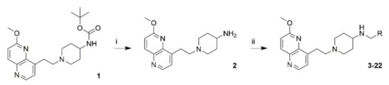 Synthesis of final compounds 3–22. Reagents and conditions: (i) 1M HCl in CH3COOH, 30 min, rt; (ii) RCHO, MeOH, CH3COOH, 2 h, then NaCNBH3, 0 °C, 10 min, then rt.