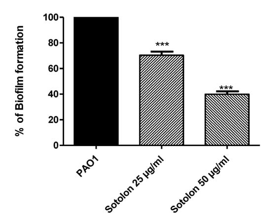 The sotolon ability to reduce the biofilm formation was quantified as previously described [2,14,48]. Briefly, PAO1 overnight cultures in TSB were prepared and diluted with TSB to an optical density OD600 nm of 0.4. Aliquots (10 µL) of the optically adjusted PAO1 suspensions were added each to 1 mL of fresh TSB with and without 25 µg/mL and 50 µg/mL of sotolon. Aliquots (100 µL) of TSB with and without sotolon were added into a 96-well microtiter plate. The planktonic cells were aspirated after incubation at 37 °C overnight, and the wells were washed thrice and left to dry. The adherent bacterial cells were fixed for 25 min with methanol, followed by staining with crystal violet (1%) for another 20 min. The excessive dye was washed, the adhered dye was dissolved in glacial acetic acid (33%), and the absorbance was measured at 590 nm using a BiotekSpectrofluorometer (Biotek, Winooski, VT, USA). The test was made in triplicate and the absorbance of sotolon treated PAO1 was shown as mean ± standard error of percentage change from untreated controls.