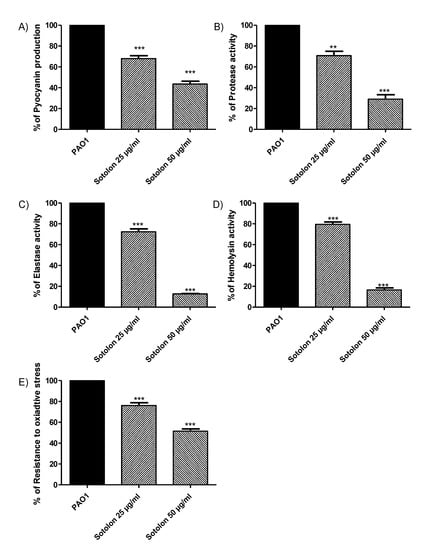 Pyocyanin bluish-green pigment is a characteristic virulence factor of P. aeruginosa. When pyocyanin production was measured in sotolon presence and absence, it was found that sotolon lowered pyocyanin levels by about 32% at 25 µg/mL and 57% at 50 µg/mL (Figure 2A). Importantly, sotolon significantly reduced the production of exoenzymes, which constitutes the core of the Ps.auerginosa arsenal. Significantly, sotolon reduced the production of protease, elastase and hemolysins by percentages 29%, 28%, and 21% at 25 µg/mL, respectively, and by percentages 71%, 87%, and 84% at 50 µg/mL, respectively (Figure 2B–D). Furthermore, sotolon effectively reduced the ability of the P. aeruginosa PAO1 strain to resist oxidative stress. The zone of inhibition of growth of PAO1 by hydrogen peroxide increased significantly in the presence of sotolon by 24% and 49% at 25 µg/mL and 50 µg/mL, respectively (Figure 2E).