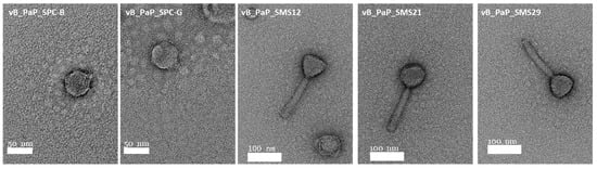 The characteristics of two phages previously isolated [15] and three additional phages were studied in terms of virion and plaque morphologies (Figure 1). Phages SPCB and SPCG had short tails resembling members of the Autographiviridae family. On the other hand, phages SMS12, SMS21, and SMS29 had long contractile tails resembling phages of the Myoviridae family.