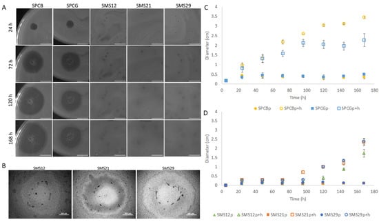 Plaque characteristics of the five phages used in this work after 24, 72, 120, and 168 h: (A) morphological characteristics (scale bar 1 cm); (B) microscopy of phages SMS12, SMS21, and SMS29 (5× objective) (scale bar 500 µm); (C) plaque diameters of phages SPCB and SPCG); (D) plaque diameters of phages SMS12, SMS21, and SMS2. Data in (C) and (D) are shown either as mean of plaque diameter (p) ± SD or mean of plaque and halo diameter (p + h) ± SD.