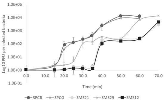 Phages SPCB and SPCG reached 141.5 ± 70.5 and 169.0 ± 52.9 PFU/infected bacteria having similar latent periods (15 min). The other three phages resulted in burst sizes of 138.5 ± 40.3 (SMS12), 209.0 ± 41.0 (SMS21), and 199.0 ± 25.5 (SMS29) PFU/infected bacteria, respectively. Despite this resemblance in burst size, SMS29 presented a 10 min shorter latent period than SMS12 and SMS21 (Figure 3).