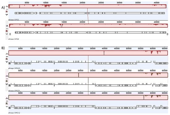 Comparison of phages from the two families: (A) Progressive MAUVE genome alignment between phages SPCB (above) and SPCG (below); (B) Progressive MAUVE genome alignment between phages SMS12, SMS21, and SMS29. White gap areas show regions that were not aligned and contain sequence elements specific to a particular genome. The height of the similarity profile presents an average level of conservation in a particular region of the genome sequence.