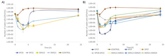 Time–kill experiments showed that Pbunaviruses (SMS12, SMS21, and SMS29) produced the best antibacterial effect (reducing approximately 4 log10 CFU/mL after 3 h). The Phikmvviruses SPCB and SPCG led to 3 log10 CFU/mL reductions (Figure 5A). After 3 h post-infection, a growth of P. aeruginosa cells was observed, which was faster for Phikmvviruses than Pbunaviruses. All phages, except SPCB, exhibited after 24 h post-infection significantly lower (p ≤ 0.05) viable cell counts compared to the controls.