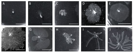 Differences in swarming behaviors were perceived, particularly in the swarm zone coverage, tendril formation, and alterations related to the swarm zone edges (Figure 7). Some survivors lost their swarming motility (Figure 7A). Furthermore, most cells presented smooth edges with wandering colonies (Figure 7D–F) or multiple fronts radiating outwards that swarmed fast due to the developed tendrils (Figure 7I,J). In addition, some survivors showed deep creases connected to the central swarm zone (Figure 7C,H), while others showed suppressors emerging from the central colony as motility flares (Figure 7B,G).