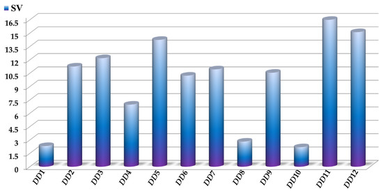 The sensitivity values SV of the D[LQI]cj descriptors are depicted in Figure 3, where the highest values indicate those D[LQI]cj descriptors with the greatest influence and discriminatory power in the mtc-QSAR-EL model. Simultaneously, the comparison between the class-based means for each D[LQI]cj descriptor represented in Table 4 shows us the type of variation that the value of a given D[LQI]cj descriptor should undergo to potentiate the anti-TB activity against the different Mtb strains.