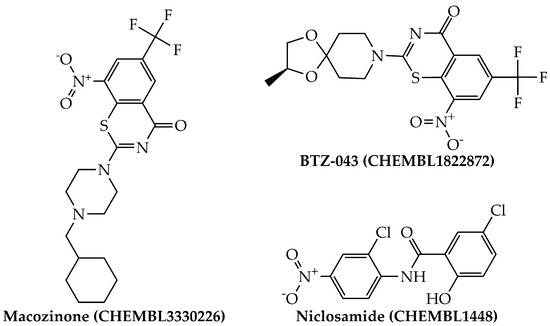 By using the aforementioned metrics for compound prioritization, the mtc-QSAR-EL model identified three chemicals with experimentally proven anti-TB activity (Figure 4): macozinone (PBTZ-169), BTZ-043, and niclosamide. Notice that macozinone is a remarkably potent piperazine-containing benzothiazinone, being able to inhibit multiple Mtb strains at MIC99 ≤ 1 nM [37]. In the case of BTZ-043, although structurally related to macozinone, it lacks the 2-(4-(cyclohexylmethyl)piperazin-1-yl) moiety, which decreases its activity. Still, BTZ-043 is a nanomolar inhibitor of several Mtb strains [37,38]. On the other hand, niclosamide offers very attractive opportunities for anti-TB therapies because, in addition to being a recognized antihelminthic drug, it also has a wide-spectrum antimicrobial profile, which includes nanomolar to micromolar potency against diverse viruses (including coronaviruses) [39], as well as anti-TB activity in the low micromolar range [40,41].