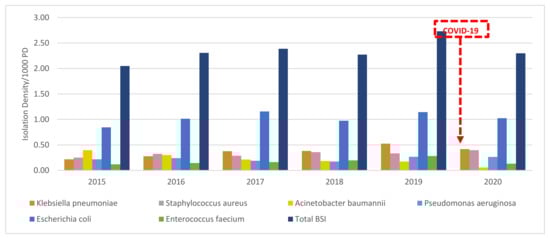 The isolation density per 1000 PD of bloodstream isolates from 2015–2020 at SGHUMC.