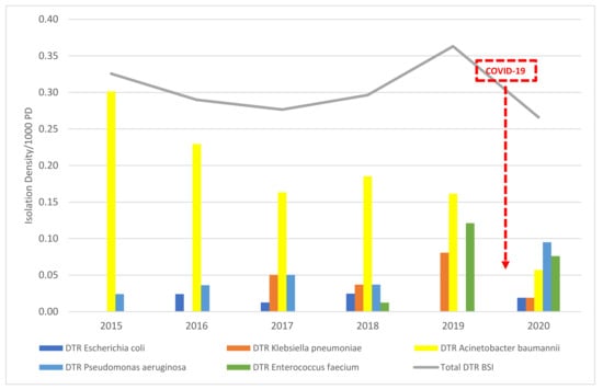 As for Sau, no DTR BSI was recorded throughout the study period, and we had an overall decrease by 22% in the isolation density of Sau from 2019 to 2020. Thus, despite the non-statistically significant increase of the isolation density of MRSA BSI, we still had limited, treatable Sau infections.