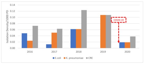 The isolation density per 1000 PD of carbapenem-resistant E. coli and K. pneumoniae bloodstream isolates from 2015–2020 at SGHUMC.