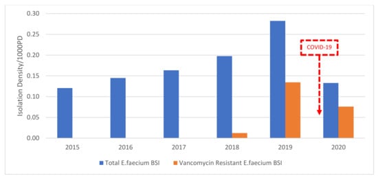 The isolation density per 1000 PD of total E. faecium and Vancomycin-resistant E. faecium bloodstream isolates from 2015–2020 at SGHUMC.