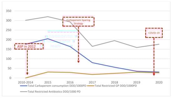 The restricted antimicrobial consumption calculated as daily define dose (DDD) per 1000 PD from 2015–2020 at SGHUMC. In 2012, the antimicrobial stewardship program’s (ASP) electronic pre-approval authorization was implemented at SGHUMC.