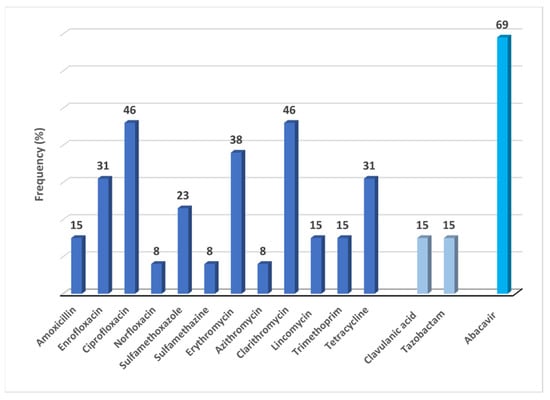 Frequency (%) of antibiotics/ enzyme inhibitors and abacavir detected in surface water.