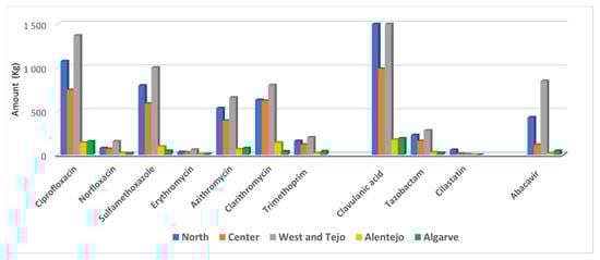 In addition to clavulanic acid (associated with amoxicillin), other detected enzyme-inhibitors, tazobactam and cilastatin, both of exclusive hospital use, showed 717 and 76 kg, respectively. They are applied in combination with piperacillin and imipenem, respectively. Regarding the different regions, it has been concluded that North and West/Tejo were the regions with the higher consuming values. Both regions presented a significant value (33%) for the abacavir. For the detected antiviral abacavir, an amount of 1458 kg has been observed.