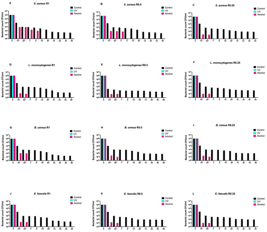 Staphylococcus aureus ATCC 6538, Listeria monocytogenes NCTT 10888, and Bacillus cereus ATCC 14579 reached the 101 logarithm after 2 h for R0.25, R1, and R0.25, respectively (Figure 4C,D,I), while Enterococcus faecalis ATCC 29212 and Listeria monocytogenes NCTT 10888 reached it for R0.25 after 4 and 6 h, respectively (Figure 4F,L).