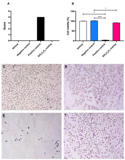 Graphical representation of (A) morphological grading score, (B) cell viability, and (C–F) microscopic images (10×) of vehicle, negative and positive control, and SiOxCyHz coating, respectively; * p < 0.05 and **** p < 0.0001.