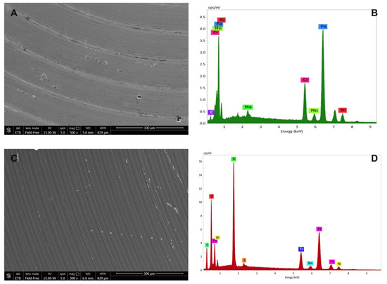 As expected, X-EDS microanalysis of uncoated stainless steel showed the presence of chromium, nickel and molybdenum, characteristic of the AISI 316L quality (Figure 6B), while the morphological picture revealed an inhomogeneous surface with the presence of some crevices and pores (Figure 6A). On the other hand, SiOxCyHz-coated stainless-steel disk surface appeared more homogeneous, indicating a uniform layer on the surface whose composition was confirmed by the X-EDS microanalysis, which showed the presence of SiOxCyHz (Figure 6C,D).