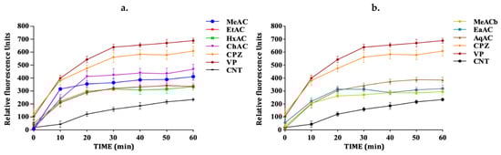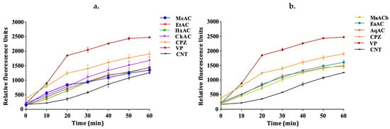 Effect of A. cepa on the accumulation of EtBr in P. aeruginosa. (a) A. cepa pink: MeAC-methanol, EtAC-ethanol, HxAC-hexane and ChAC-chloroform; (b) Allium cepa white: MeACb-methanol, EaAC-ethanol, AqAC-aqueous, CPZ—chlorpromazine; VP-verapamil; CNT-control.