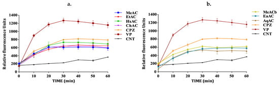Effect of A. cepa on the accumulation of EtBr in S. aureus. (a) A. cepa pink: MeAC-methanol, EtAC-ethanol, HxAC-hexane and ChAC-chloroform; (b) Allium cepa white: MeACb-methanol, EaAC-ethanol, AqAC-aqueous, CPZ—chlorpromazine; VP-verapamil; CNT-control.
