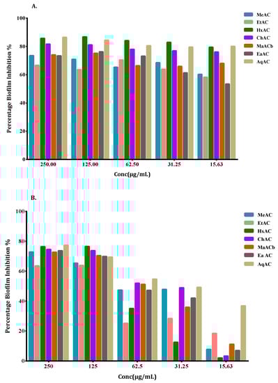 The ability of the Allium extracts to inhibit biofilm formation was measured using the microtiter plate-based assay as described. A volume (180 µL) of each diluted culture was pipetted into a 96-well flat-bottom microtitre plate. Two-fold serial dilutions of the extracts were made with Tryptic soy broth (TSB) to achieve sub-minimum inhibitory concentrations ranging from 250–15.63 µg/mL. An amount (20 μL) of the extract’s solution was then pipetted into each of the 96-well plates. The plates were incubated undisturbed for 24 h at 37 °C. Wells containing only microorganisms were included to serve as the growth control. After 24 h of incubation at 37 °C, the supernatant was collected and the plates were washed, fixed and stained as described above. The optical density of each well was measured at 600 nm (OD600) using an automated plate reader. The bioassay was performed in duplicate. The mean absorbance of the samples was determined, and the percentage inhibition of biofilm was calculated using the equation:
