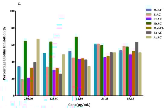 All the other extracts moderately inhibited biofilm formation in P. aeruginosa at concentrations of 125 µg/mL and 250 µg/mL. Unlike the M. smegmatis and P. aeruginosa strains, the S. aureus strain was less susceptible to biofilm inhibition by the extracts. However, the hexane extract of pink A. cepa was significantly effective at inhibiting S. aureus biofilms (~69.3%). The aqueous extract of white A. cepa was also effective at inhibiting biofilm formation at a sub-inhibitory concentration of 62.5 µg/mL (~66.8%) (Figure 6C).