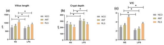 Effects of RLS on jejunum morphology in broilers challenged with LPS. (a) Effect of RLS on villus length. (b) Effect of RLS on crypt depth. (c) Effect of RLS on villus height/crypt depth ratio (V/C). NS-NCO represents control broilers treated with normal saline. NS-ANT represents broilers treated with the antibiotic; NS-RLS represents broilers treated with rhamnolipids; LPS-NCO represents control broilers challenged with LPS; LPS-ANT represents broilers treated with the antibiotic and challenged with LPS; LPS-RLS represents broilers treated with rhamnolipids and challenged with LPS; * and different superscript letters indicate significant differences (p < 0.05), majuscule present NS-groups and lowercase present LPS-groups, n = 6.