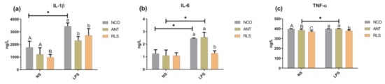 We found that birds in the NS-RLS- and NS-ANT-treated groups had lower concentrations of IL-1β, IL-6, and TNF-α compared with those in control birds (p < 0.05; Figure 3), whereas the levels of IL-1β and IL-6 were shown to be significantly increased in LPS-challenged birds compared with those of the saline-treated ones (p < 0.05). We further noted that compared with LPS-CON, LPS-RLS birds had lower levels of IL-1β, IL-6, and TNF-α (p < 0.05).