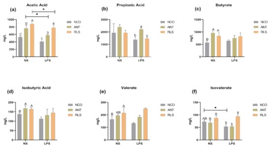 Effects of RLS on SCFAs in colon morphology in broilers challenged with LPS. (a) Effect of RLS on acetic acids. (b) Effect of RLS on prophionic acid. (c) Effect of RLS on butyrate. (d) Effect of RLS on isonutyric acid. (e) Effect of RLS on valerate. (f) Effect of RLS on isovalerate. NS-NCO represents control broilers treated with normal saline; NS-ANT represents broilers treated with the antibiotic; NS-RLS represents broilers treated with rhamnolipids; LPS-NCO represents control broilers challenged with LPS; LPS-ANT represents broilers treated with the antibiotic and challenged with LPS; LPS-RLS represents broilers treated with rhamnolipids and challenged with LPS; * and different superscript letters indicate significant differences (p < 0.05), majuscule present NS-groups and lowercase present LPS-groups, n = 6.