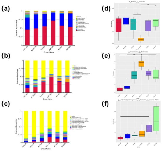 Effects of RLS on microbial community in caecum contents in broilers challenged with LPS. (a–c) The top 10 taxa by relative abundance within the microflora community ((a): phylum; (b): genus; (c): species). (d–f) Species with significant inter-group differences (d): phylum; (e): genus; (f): genus. NS-NCO represents control broilers treated with normal saline; NS-ANT represents broilers treated with the antibiotic; NS-RLS represents broilers treated with rhamnolipids; LPS-NCO represents control broilers challenged with LPS; LPS-ANT represents broilers treated with the antibiotic and challenged with LPS; LPS-RLS represents broilers treated with rhamnolipids and challenged with LPS; * and different superscript letters indicate significant differences (p < 0.05), ** represents very significant differences (p < 0.01). n = 6.
