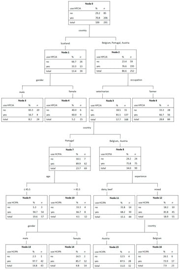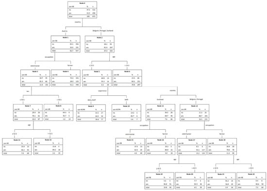 Of the 458 respondents using antibiotics for the treatment of NCD, 404 participants provided more information in the question “if you usually use antibiotics-please state when” and “please state approximate %”. Of those, 30.7% (n = 124) stated that they used antibiotics always and 69.3% (n = 277) in some situations (Figure S1), namely in an average of 48.5% ± 28.7% (median 50%). CART analysis resulted in the country as the most important factor to classify the frequency of antibiotic use, followed by experience with normalized importance of 68.6%, age (42.3%), occupation (7.1%), and sex (4.5%). Participants from Portugal and Scotland used antibiotics significantly more frequently in every case without differentiating further (in some situations: 54.1%, n = 92; always: 45.9%, n = 78) compared to respondents from Austria and Belgium (in some situations: 80.3%, n = 188; always: 19.7%, n = 46). Out of the total of 88 respondents working with beef cattle in Scotland and Portugal, 65 (farmers and veterinarians) used antibiotics for the treatment of NCD, and 44% of those (n = 39) stated that they used them always when treating NCD. Participants younger than 41.5 years working with dairy cattle and mixed cattle used antibiotics significantly more often in every case of NCD compared to older participants (>41.5 years).