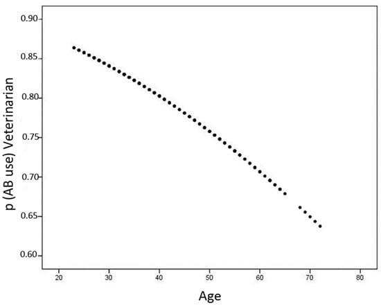 Logistic regression analysis showed a significant impact of age on the probability of antibiotic use for the treatment of NCD in veterinarians (Figure 2, intercept = 2.45; slope = −0.026; p = 0.031). The younger the veterinarians were, the higher the probability of using antibiotics. However, even in older veterinarians, the probability was still over 60%. Regarding the use of HPCIA, there was no significant relation with age in veterinarians.