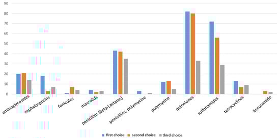 When farmers and veterinarians were asked, “Which antibiotic do you use as first, second, and third choice for the treatment of calves with diarrhea?”, quinolones, sulfonamides, and penicillins were the three antibiotic classes most frequently named in all three choice categories (Figure 3). All antibiotics that were stated in this questionnaire were licensed for use in cattle, but several were not licensed for the treatment of diarrhea in calves specifically, including ceftiofur and cefoperazon (third generation cephalosporins), tulathromycin and tilmicosin (macrolids), as well as florfenicol (fenicoles). All used quinolones were licensed for cattle and most of them for treatment of infections of the gastrointestinal tract caused by enrofloxacin, danofloxacin, or flumequin susceptible strains of E. coli (e.g., Advocid®, Enrosleecol®, Fluyesyva inyectable®). However, several marbofloxacin drugs (e.g., Marbocyl®, Marbosyva®, Marbox®, Ubiflox®) were stated as well, although they were only licensed for the treatment of mastitis and respiratory infections.