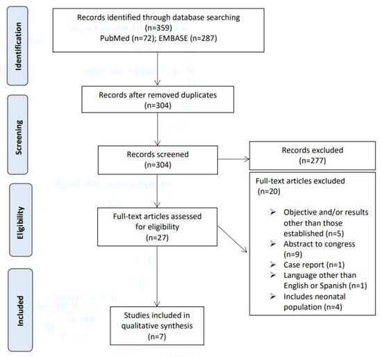 After title and abstract screening, a further 277 studies were deemed ineligible because they did not meet the inclusion criteria according to the PICOS question, mainly because it did not include a pediatric population or evaluate the pharmacokinetics of other antibiotics. The 27 potentially relevant studies were reviewed in full text, of which 20 were excluded before data extraction. Seven met the inclusion criteria and were therefore included in this systematic review (Figure 1).