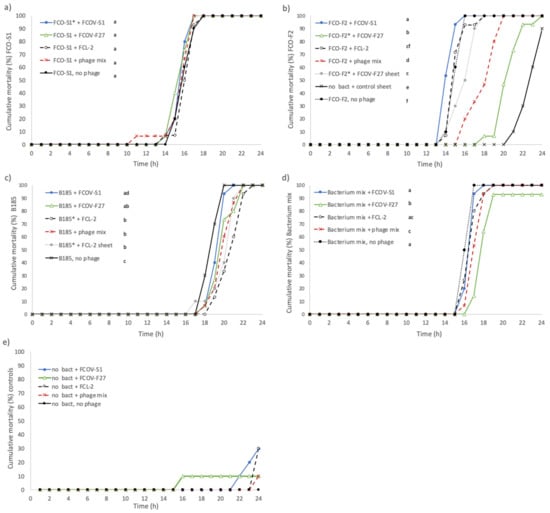 Experiment I: Cumulative mortalities (%) of rainbow trout fry infected with Flavobacterium columnare isolates (a) FCO-S1, (b) FCO-F2, (c) B185, and (d) their mix, and treated with F. columnare phages FCOV-S1, FCOV-F27, and FCL-2, their mix and plastic sheets coated with FCOV-F27 and FCL-2. Mortality related to control treatments without bacterial infections are presented in panel (e), except for the plastic control sheet (no phage coating) presented in panel (b). The bacterial host of the phage is indicated by an asterisk in each panel. Different lower-case letters a-f indicate statistical difference (p < 0.05, Kaplan–Meier survival analysis, log rank pairwise comparisons, Mantel–Cox) between the treatment groups (n = 15 rainbow trout in treatments receiving both phage and bacteria, and 10 fish in sheet and control treatments, total n of fish = 360).