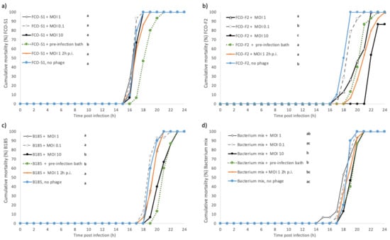 Experiment II: Cumulative mortalities (%) of rainbow trout fry infected with Flavobacterium columnare isolates (a) FCO-S1, (b) FCO-F2 (c) B185, and (d) their mix, and treated with a mix of phages FCOV-S1, FCO-F27, and FCL-2. Phage mixes were added at the same time as bacteria (0 h) at MOI 1, 0.1, and 10, 2 h post-bacterial infection at MOI 1 (MOI 1 2 h post-infection, p.i.) or given as a 2-h bath exposure at MOI 1 before adding the bacteria (pre-infection bath). Different lower-case letters a-c indicate statistical difference (p < 0.05, Kaplan–Meier survival analysis, log rank pairwise comparisons, Mantel–Cox) between the treatment groups (n = 15 in phage treatments, n = 10 in controls, total n = 400).