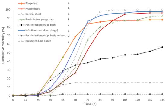 Experiment III: Cumulative mortalities (%) of rainbow trout fry infected with a mix of Flavobacterium columnare isolates FCO-F2 and B185. Rainbow trout were kept in three replicate aquaria per treatment (48 fish each) except for controls, which included only a single aquarium (total n of fish in experiment = 960). The fish were fed 7 days before the infection with phage mix-coated (FCOV-F27 and FCL-2) feed (phage feed), kept with the phage mix-coated sheet (phage sheet), or a control sheet without phage mix (control sheet) during the whole experiment starting from 7 days before bacterial infection, or treated with a 2-h phage mix bath one day before bacterial infection (pre-infection phage bath) and right after the first symptoms of columnaris disease appeared after the bacterial infection (post-infection phage bath). Negative controls for pre-infection phage bath and phage feed did not cause any mortality and are not shown in the graph. Different lower-case letters indicate statistical difference (p < 0.05, Kaplan–Meier survival analysis, log rank pairwise comparisons, Mantel–Cox) between the treatment groups.