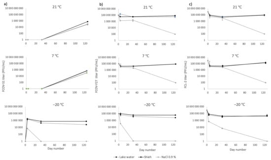 In a second experiment, phage shelf-life was tested at different temperatures (−20 °C, 7 °C, and 20 °C) using Shieh medium, lake water (from Lake Jyväsjärvi), and 0.9% NaCl as preservation media. In general, phage survival was best in Shieh medium and in lake water (Figure 5). FCOV-F27 and FCL-2 titers did not drop more than approximately 1 log during the 125 days in all conditions if stored in Shieh medium or lake water. However, in 0.9% NaCl, the infectivity of phages remained stable at room temperature and at 7 °C up to 32 days (second sampling timepoint), after which the phage titers started to decrease, leading to a titer of approximately 102 PFU mL−1 on day 125 (Figure 5). FCOV-S1 titers could not be determined at room temperature or at 7 °C during the first sampling point days due to poor growth of the host, but high titers (around 106 PFU mL−1) in all media were detected on day 125. All three phages could be revived from 149 and 468 days of dry conditions (data not shown).