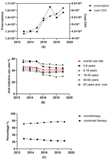 Yu, Z.; Zhu, J.; Jin, J.; Yu, L.; Han, G. Trends in Outpatient Prescribing Patterns for Ocular Topical Anti-Infectives in Six Major Areas of China, 2013–2019. Antibiotics 2021, 10, 916. https://doi.org/10.3390/antibiotics10080916