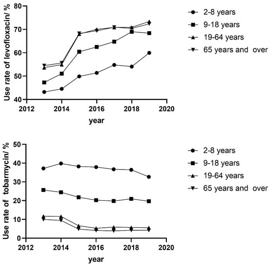 | Tobramycin | 17,248(13.6) | 17,723(13.7) | 11,947(9.22) | 11,748(8.07) | 12,536(8.25) | 12,862(8.29) | 13,039(7.98) |