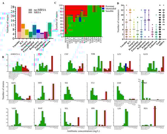 Antibiotic-resistance profile of the S. aureus strains. (A) Percentage of the S. aureus isolated in different hospital units. (B) S. aureus strains MIC distribution for the 18 antibiotics tested. The MICs range for sensitive strains is in green, intermedial in blue, and resistant strains in red. (C) The proportion of resistant, sensitive, and/or intermedial strains for each antibiotic tested. (D) Number of resistance identity by strain and medical care unit. Each dot represents one strain. MRSA indicates the number of resistances in OXA resistant strains. Miscellaneous represents a group of samples isolated from different hospital-care units such as Oncology (2), Rheumatology (1), Infectious Diseases (1), Pediatric (1), and Otorhinolaryngology (1).