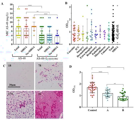 (A) Antimicrobial activity of AS-48 alone or in combination with lysozyme against the clinical S. aureus isolates. Each dot represents one strain. **** Significant differences at p < 0.0001. ** Significant differences at p = 0.0032 (B) Evaluation of biofilm formation for the different isolates according to their isolation source. Each dot represents one strain. Total indicates these values for all strains and MRS for the OXA positive isolates (C) Optical microscopy of stained biofilms formed by strains representative of the different biofilm formation capacities (OD595). Strain 18 OD595 = 0.13, strain 78 OD595 = 0.87, strain 174 OD595 = 1.51, and strain 33 OD595 = 3.11. (D) Antimicrobial activity of AS-48 on S. aureus 33 biofilms. A shows cell viability after 48 h in the presence of 32 mg/L AS-48 when kept unrenewed and B shows the cell viability of biofilms when washed after 24 h of treatment and added AS-48 again at the same concentration. The dots, triangles, and squares represent replicates for each of the indicated treatments or control. **** Significant differences at p < 0.0001. ** Significant differences at p = 0.0051.