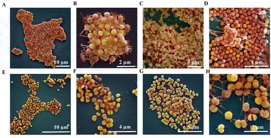 Biofilms of S. aureus 33 observed under scanning electron microscope. (A,B) Control biofilms formed after 24 h. (C,D) Control biofilms formed after 48 h. (E,F) Biofilms treated for 48 h with 16 µg/mL AS-48. (G,H) Biofilms treated for 48 h with 32 µg/mL.