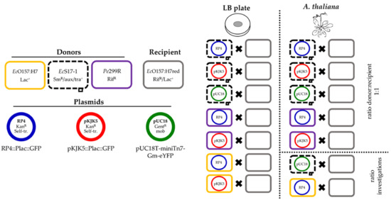 Overview of performed experiments. Three donors, EcO157:H7, EcS17-1, and Pe299R, were combined with up to three different plasmids, RP4, pKJK5, or pUC18. The ability of the hosts to transfer the plasmids to the recipient EcO157:H7red was assessed on membrane filters and gnotobiotic A. thaliana. Additionally, the effect of different donor/recipient ratios onto conjugation frequency was assessed for two exemplary donor and plasmid combinations.
