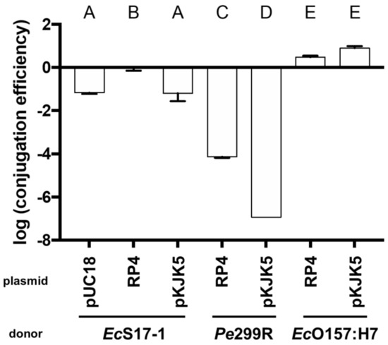 Transconjugant frequencies in the recipient population after mating of the recipient EcO157:H7red with EcS17-1, Pe299R, and EcO157:H7 donors carrying plasmids pUC18, pKJK5, or RP4 on nitrocellulose filters. Error bars represent the standard deviation of the mean. Significant differences between treatments are marked with different letters (p-value < 0.01, one-way ANOVA, Tukey’s multiple comparison test).
